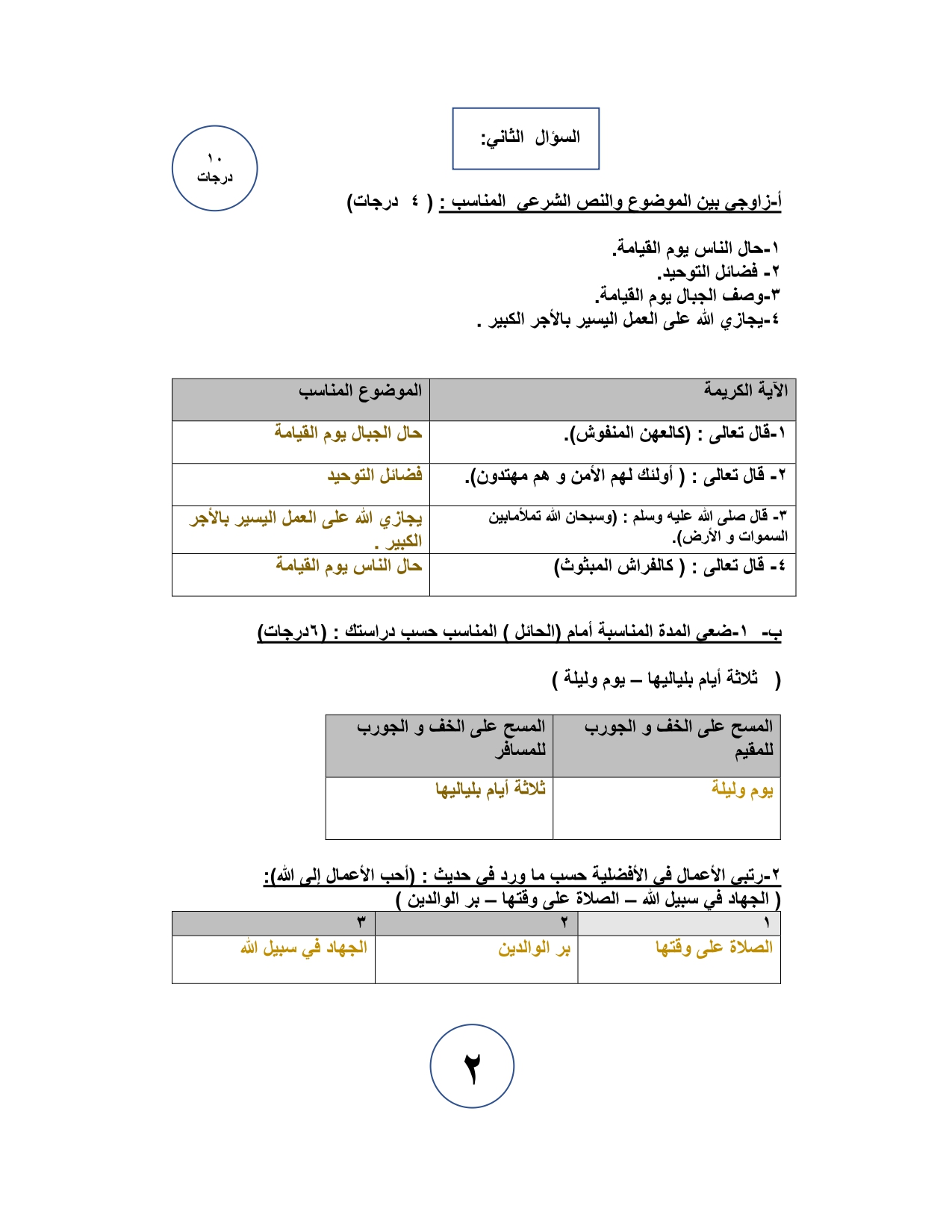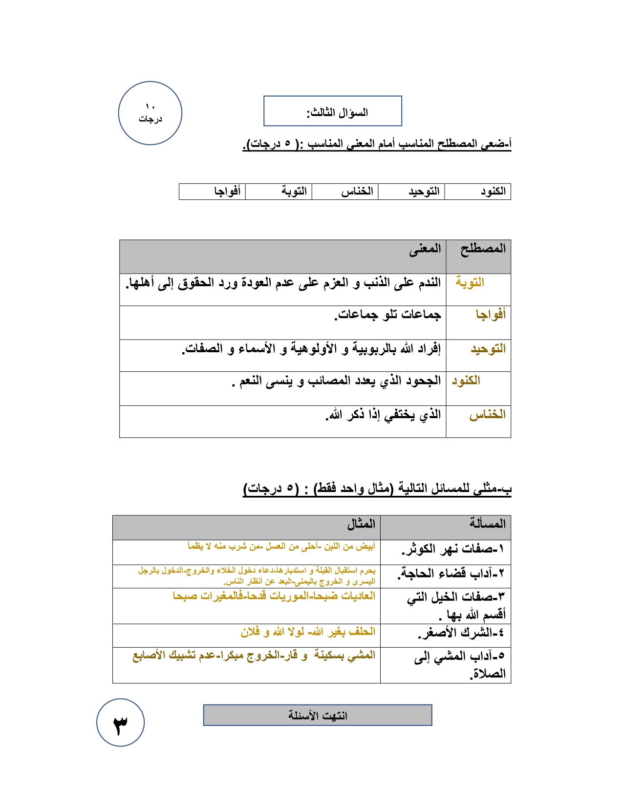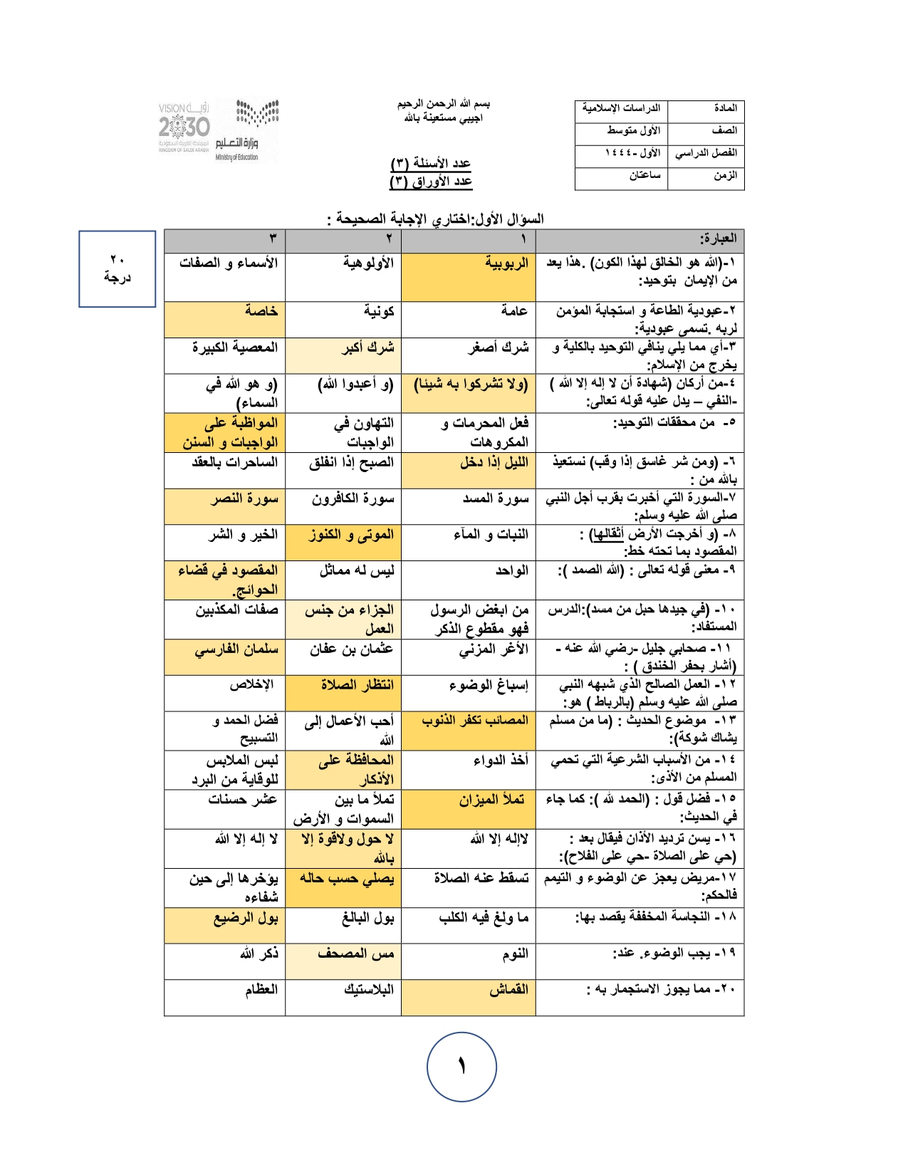 اختبار دراسات اسلاميه اول متوسط نهائي