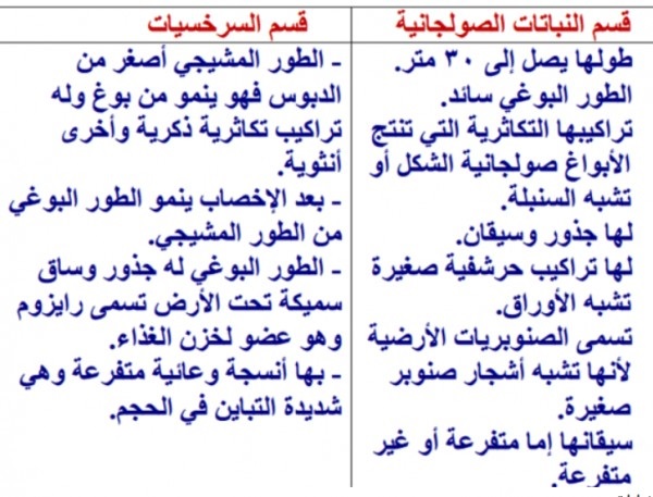 اعمل جدولا تبين فيه خصائص مجموعات النباتات