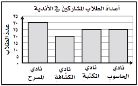 التمثيل بالاعمده لاعداد الطلاب المشاركين في كل من النوادي الاربعه