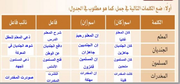ضع الكلمات التالية في جمل كما هو مطلوب في الجدول