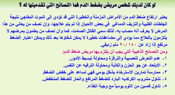 لو كان لديك شخص مريض بضغط الدم فما النصائح التي تقدمينها له
